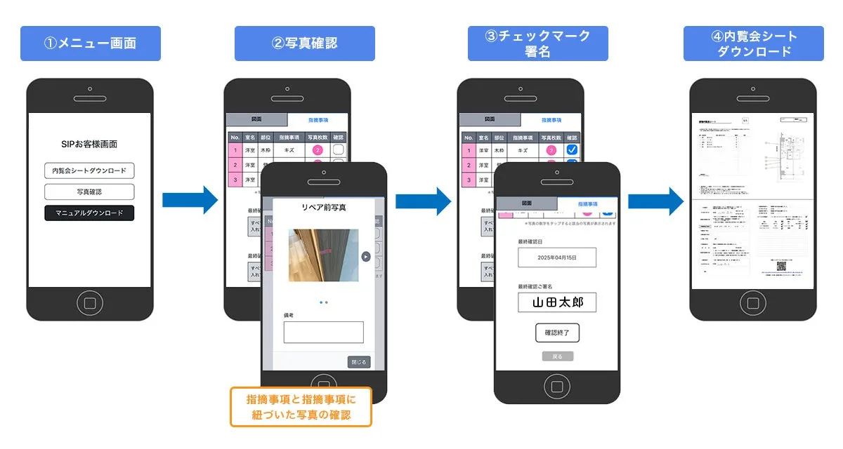 スマートフォンの専用メニューから「内覧会シートダウンロード」や「写真確認」の項目も利用可能。購入者は、契約住戸の図面を見ながら、該当する指摘事項や撮影された写真を参照でき、全ての指摘事項が確認されると電子署名が実行可能になります。これにより、ペーパーレス化も進行します。