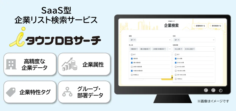 iタウンDBは2000年から運営されているデータベースで、約800万件の企業情報を持ち、業種や地域ごとに分類されています。信頼性の高い情報を提供し、企業の成長を支援する信頼できる基盤です。