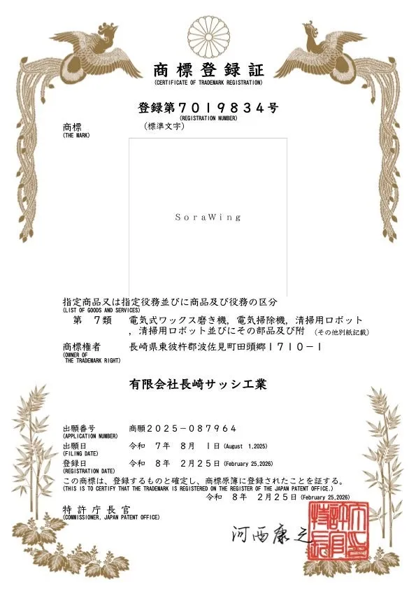 長崎県東彼杵郡波佐見町に本社を置く有限会社長崎サッシ工業(代表取締役:田中正一)は、新たに開発中の高所窓洗浄ロボットの名称「SoraWing(ソラウィング)」の商標登録手続きが完了したことを発表しました。また、今回同時にブランドロゴも決定しました。