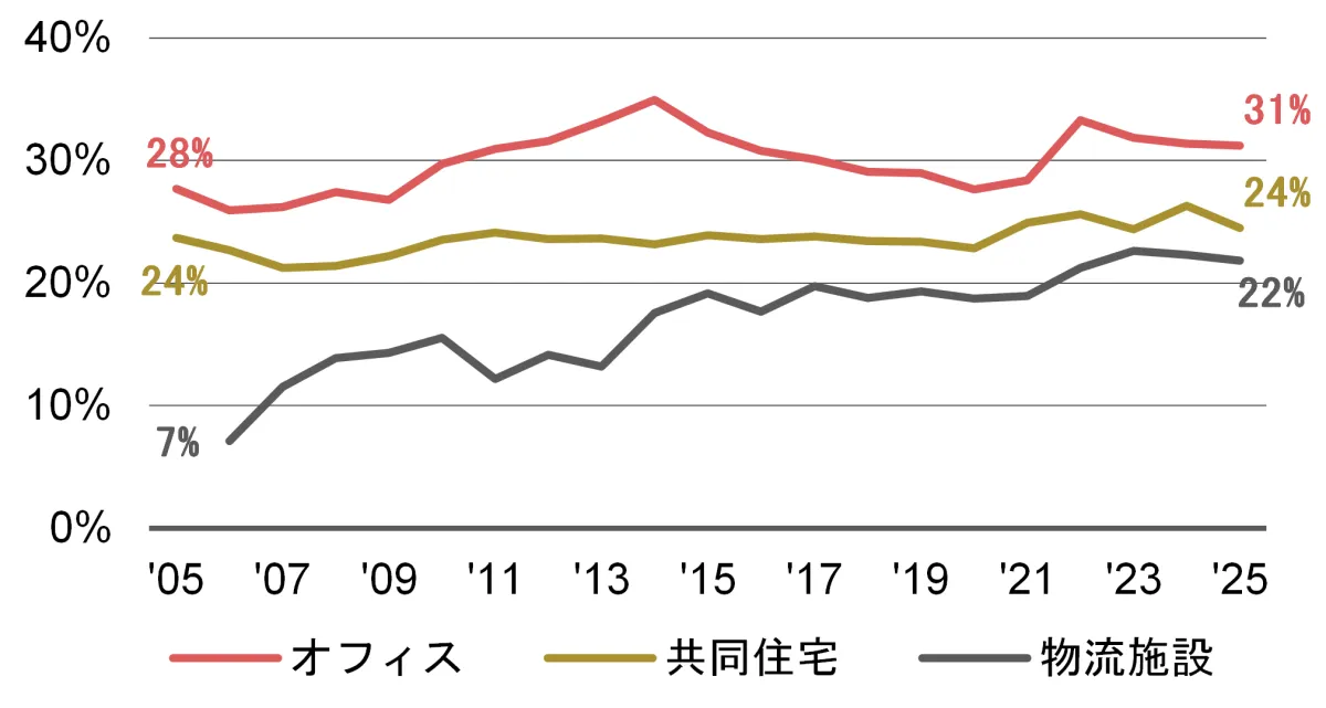 まず、アセットタイプ別に見てみると、経費率は用途によって異なる上昇傾向を示しています。ここでの支出構造は物価、地価、築年数、設備仕様など、様々な要因が影響を与えています。これに対し、今後の不動産運用戦略には、支出の増加を前提としつつ、資産価値の維持・向上につながる投資戦略が重要であるとされています。