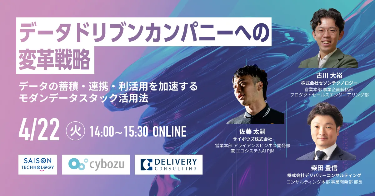 データ活用は現代のビジネス環境において、企業成長の鍵であることは明白です。その中で、株式会社デリバリーコンサルティングが主催し、株式会社セゾンテクノロジーおよびサイボウズ株式会社との共同で、WEBセミナー「データドリブンカンパニーへの変革戦略 〜データの蓄積・連携・利活用を加速するモダンデータスタック活用法〜」が開催されます。具体的な日時は2025年4月22日(火)14:00から15:30まで、参加は無料で定員は100名です。