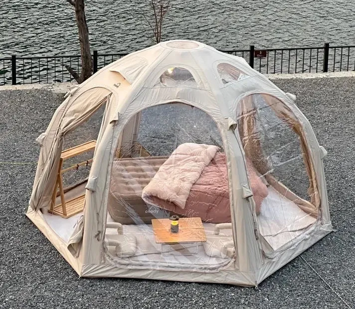 「Aurora Mini」は、従来の「Aurora」の魅力を凝縮した、扱いやすい4メートルサイズのエアテントです。6面にわたる大きな窓から、贅沢な光を取り入れ、外の景色を楽しみながら開放感を提供します。ソロキャンプやデュオ、ファミリーキャンプなど、あらゆる利用シーンに対応可能な柔軟なデザインが大きな特徴です。