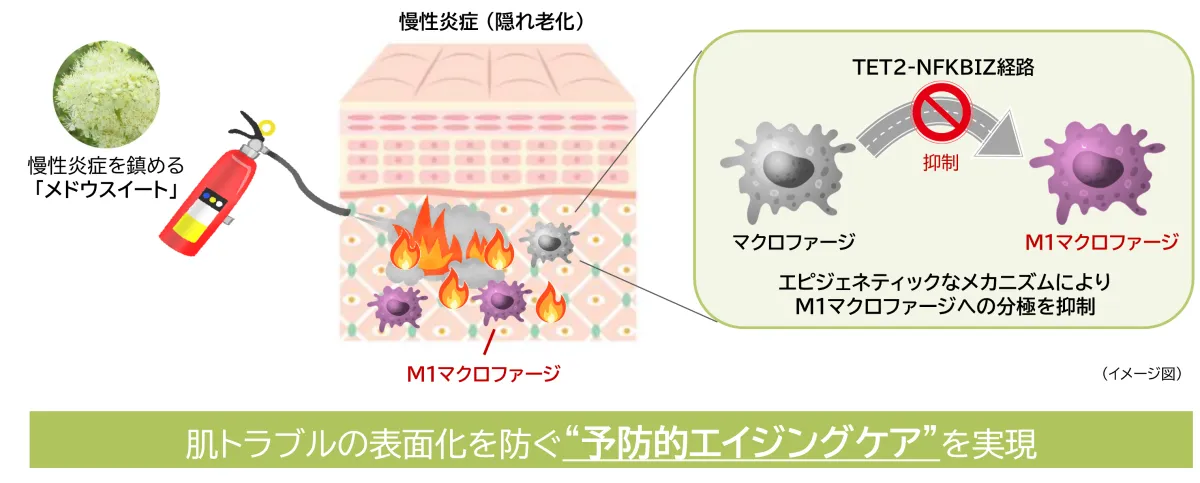 さらに、研究は「メドウスイート」が持つエピジェネティックな効果にも焦点を当てました。TET2とNFKBIZという炎症関連遺伝子の調節において、メドウスイートが重要な役割を果たすことが示されています。このメカニズムにより、マクロファージの分極を調整できる可能性があり、自然由来成分によるエイジングケアの新しいパラダイムを提供しています。