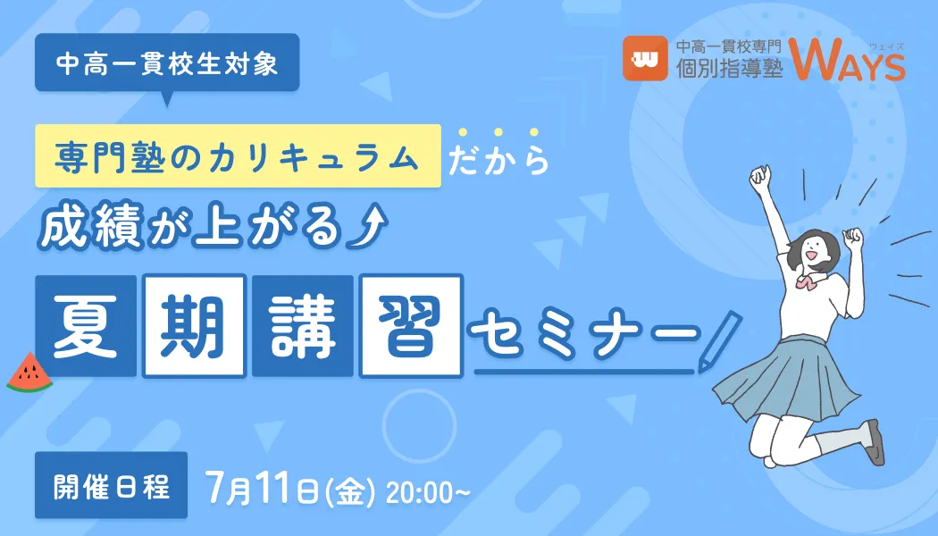 中高一貫校に通う生徒とその保護者の皆様へ、特に夏休みに役立つオンラインセミナーが開催されます。主催は、東京都新宿区の株式会社メイツが運営する「中高一貫校専門 個別指導塾WAYS」です。このセミナーでは、過去500校以上の指導実績を持つ塾のプロフェッショナルたちが、効果的な学習方法を提案します。