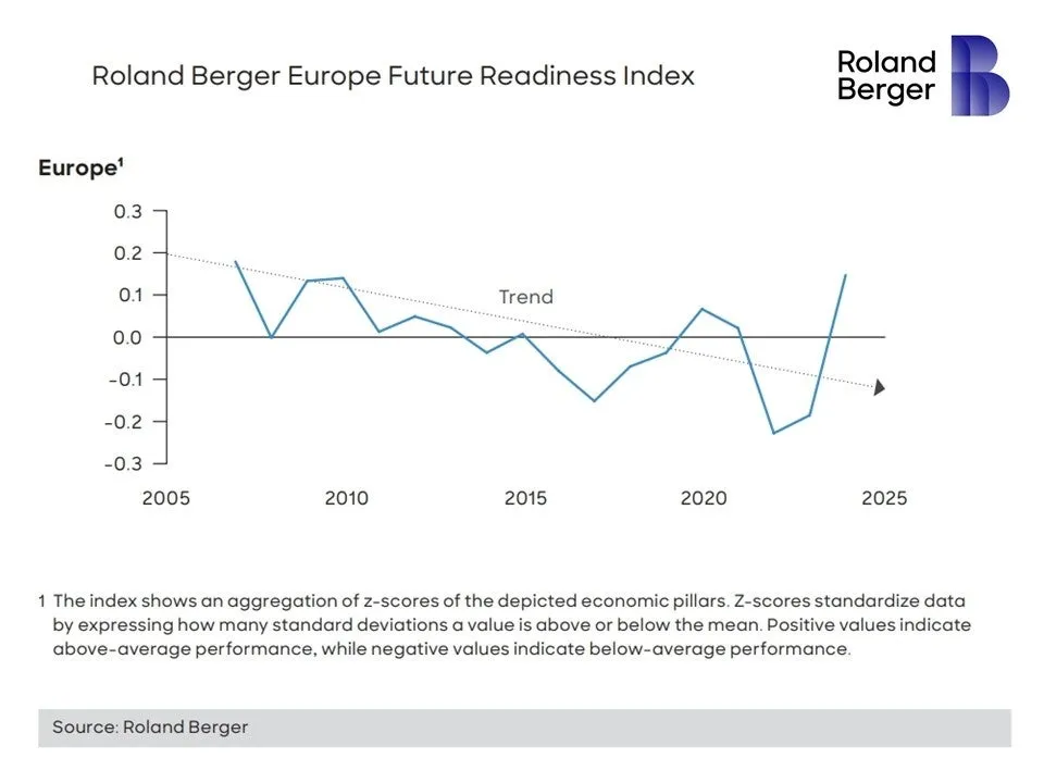 2026年1月21日、世界経済フォーラム(ダボス会議)において、ローランド・ベルガーは新しい指標「欧州成長基盤指数」を発表しました。この指数は、欧州の競争力の進化を評価するもので、過去20年間のデータをもとにしています。特に注目すべきは、過去に見られた競争力の低下傾向から、回復の兆しが見え始めた点です。