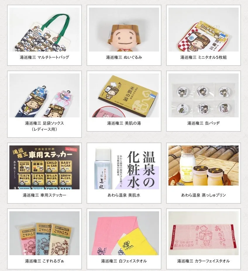 あわら市内や観光センター「おしえる座ぁ」では、湯巡権三とその兄弟をテーマにした各種グッズが販売されています。コレクションアイテムとしても最適です。