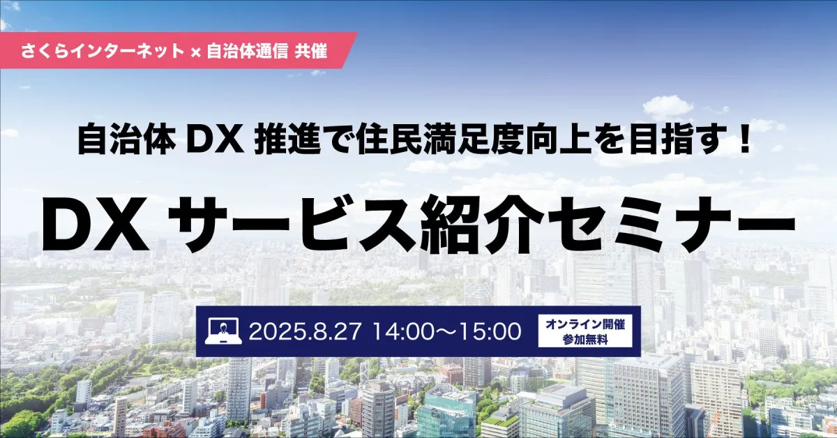 2025年8月27日(水)、さくらインターネットと自治体通信が共催で「自治体DX推進で住民満足度向上を目指す!DXサービス紹介セミナー」を開催します。このセミナーは、地方自治体の関係者を対象にしたウェビナー形式で行われ、参加費は無料です。