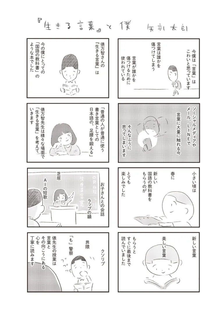 矢部さんは、自らの体験を元に、「言葉が怖い」と感じている心情を表現しています。スマホやSNSが浸透した現代社会では、多くの人が言葉の使い方に悩み、言葉の力の重要性を再認識する必要があります。彼は、俵さんの『生きる言葉』と出会い、言葉への信頼感を少しずつ取り戻していく様子を描いています。この感想マンガは、新潮社の読書情報誌「波」に掲載されたものですが、深みのある内容が多くの読者の感情を揺さぶります。