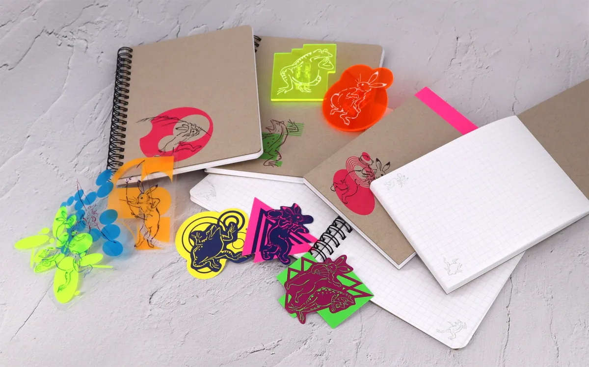 このように、多種多様な商品ラインナップが揃っており、どれもが「鳥獣戯画」の愛らしいキャラクターたちをビビッドカラーで表現しています。特に、墨一色の線描と組み合わされた蛍光色は、従来の作品とは一味違った新しい印象を与えています。