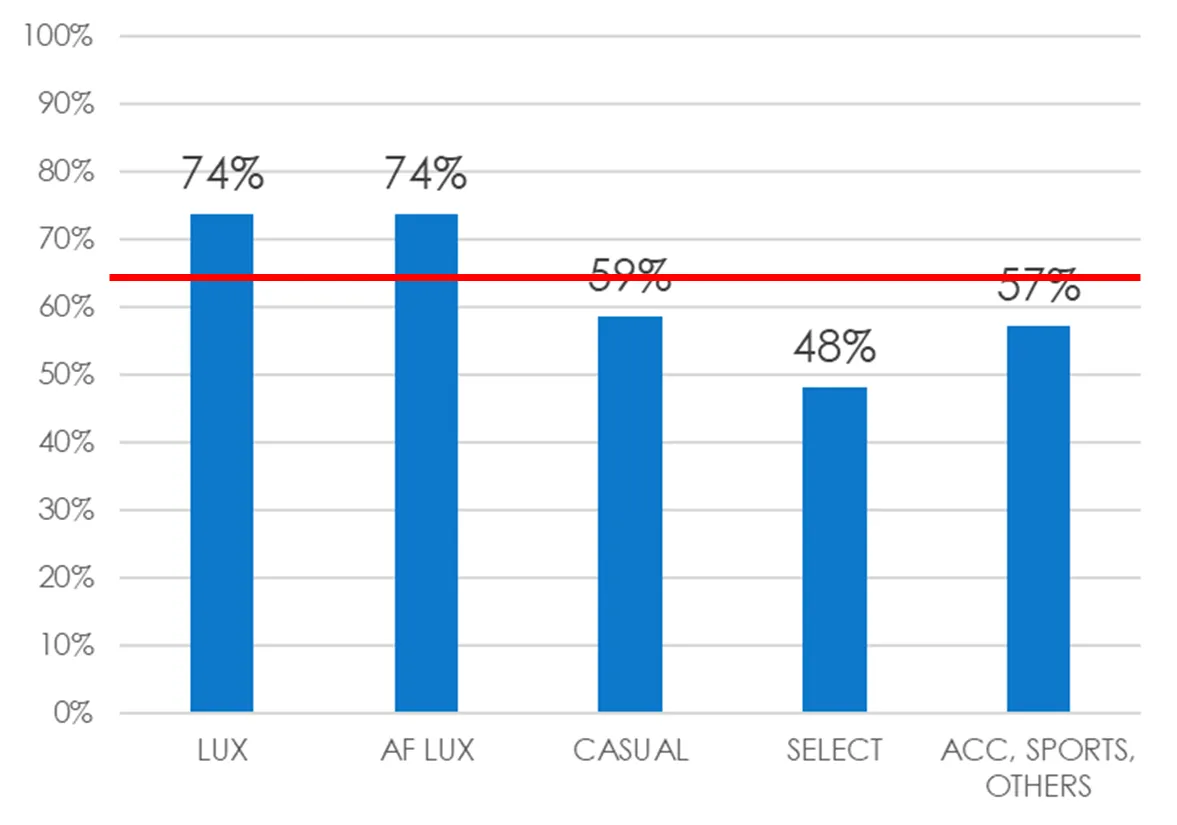 一方、アフォーダブルラグジュアリーブランドは、幅広い顧客層に対して良好な接客を提供し、総合点を3ポイント上げる結果となりました。若年層をターゲットにした、このブランドの成功は、ただ商品力だけでなく、接客の質が向上したことによるものです。