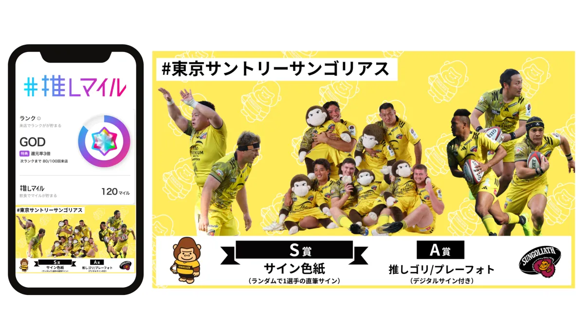 東京サントリーサンゴリアスが、日常の飲食を通じてスポーツを応援する新しいサービス「推しマイル」を2026年4月4日(土)から開始します。この新たな応援プラットフォームは、サントリースポーツ株式会社が運営する「サントリーサンバーズ大阪」とのコラボレーションにより実現したもので、アバターダイニングラボ有限責任事業組合が提供しています。全国の「PRONTO(プロント)」店舗で、飲食による日常的な応援体験を楽しむことができます。