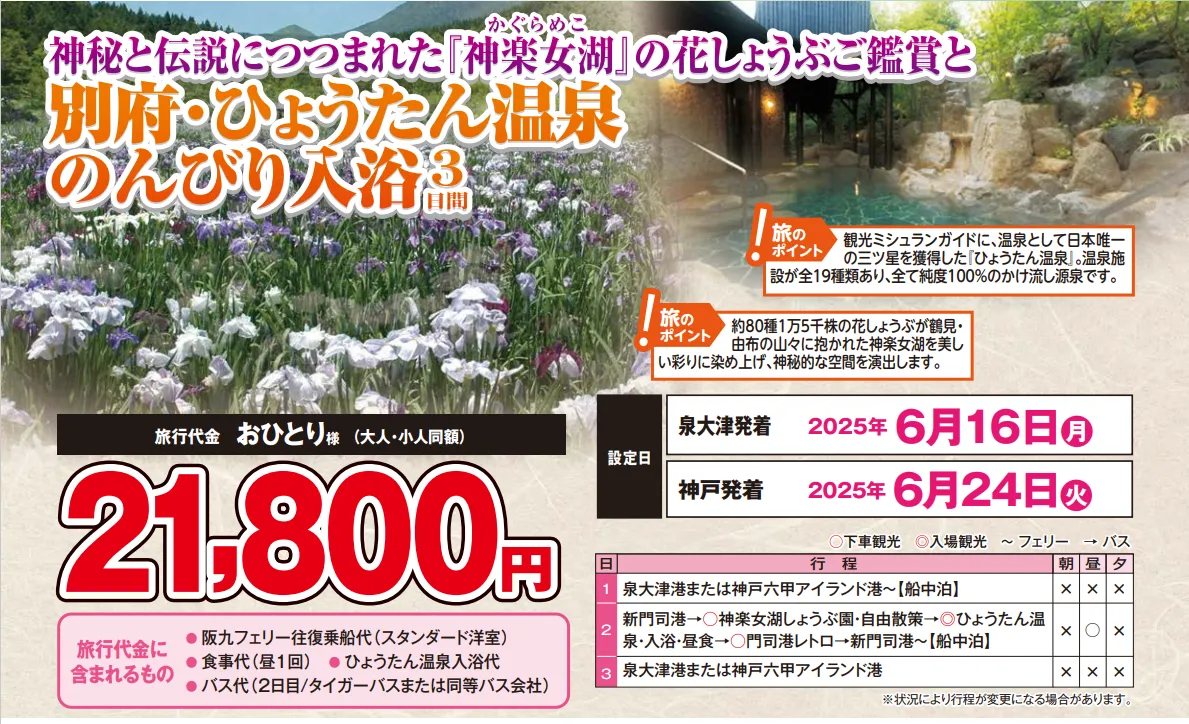 2025年の初夏、関西から出発する特別なバスツアーが登場します。このツアーでは、神秘と伝説の世界に包まれた『神楽女湖』での花しょうぶ観賞と、別府のひょうたん温泉でのんびり入浴を楽しむことができます。旅行代金はたったの21,800円!