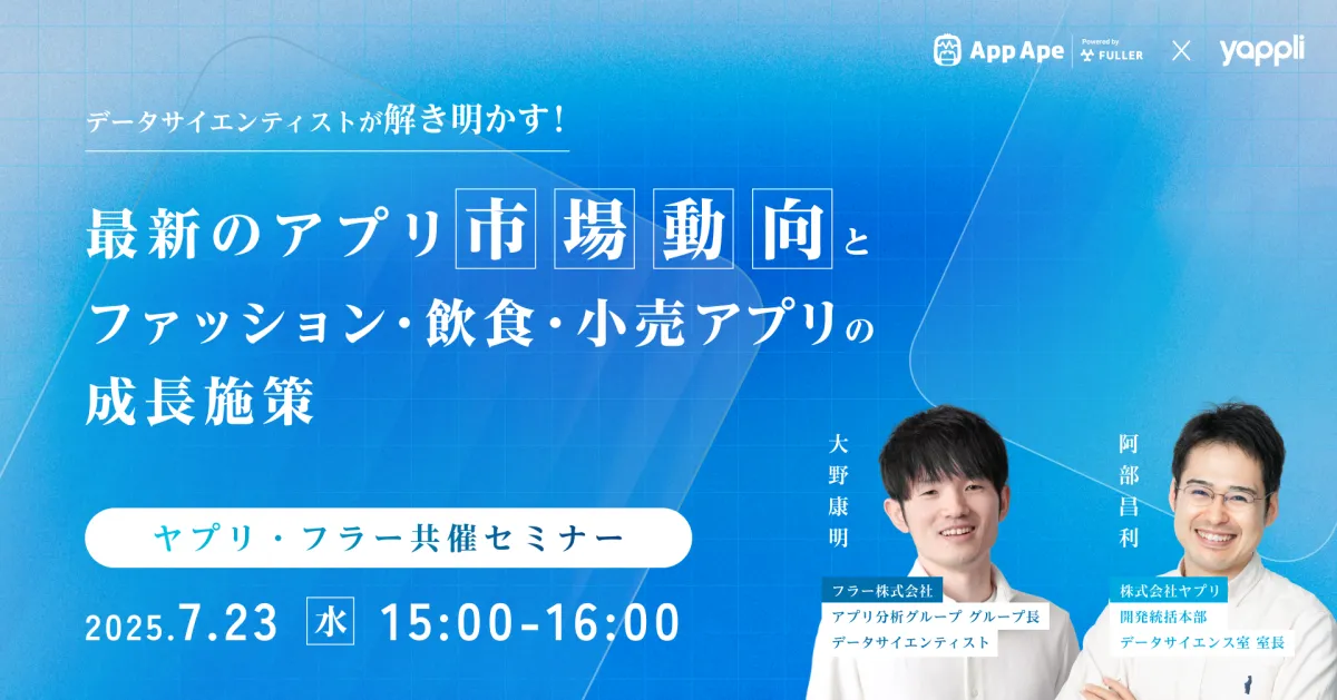 2025年7月23日(水)、フラー株式会社と株式会社ヤプリが共催するオンラインセミナーが開催されます。このセミナーでは、「データサイエンティストが解き明かす!最新のアプリ市場動向とファッション・飲食・小売アプリの成長施策」と題され、アプリ業界の最新情報を提供します。