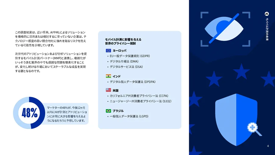 今日のデジタルマーケティング環境では、Appleの「SKAdNetwork」やGoogleの「Android向けプライバシーサンドボックス」といったプライバシー対応フレームワークが急速に普及しています。これにより、デバイス固有のデータ利用が制限され、マーケターは新たな戦略が求められています。本レポートでは、プライバシー保護がモバイル計測に与える影響についても詳しく解説しており、AIを活用した新アプローチがその課題の克服にどう寄与しているかを探ります。