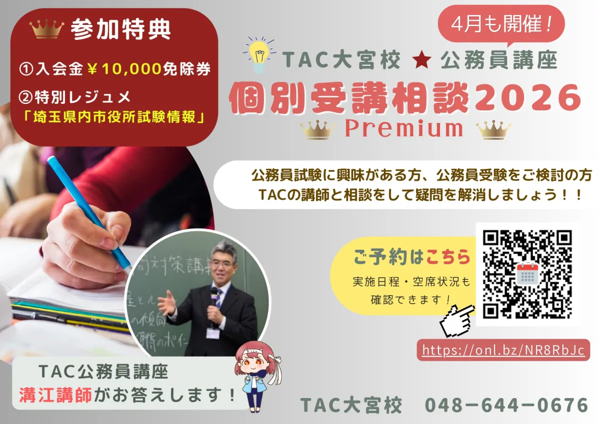 公務員試験を目指している皆さんに朗報です。TAC株式会社が運営するTAC大宮校では、2026年の公務員試験に向けた個別受講相談を無料で行っています。このイベントは予約が必要ですが、それだけの価値があります!