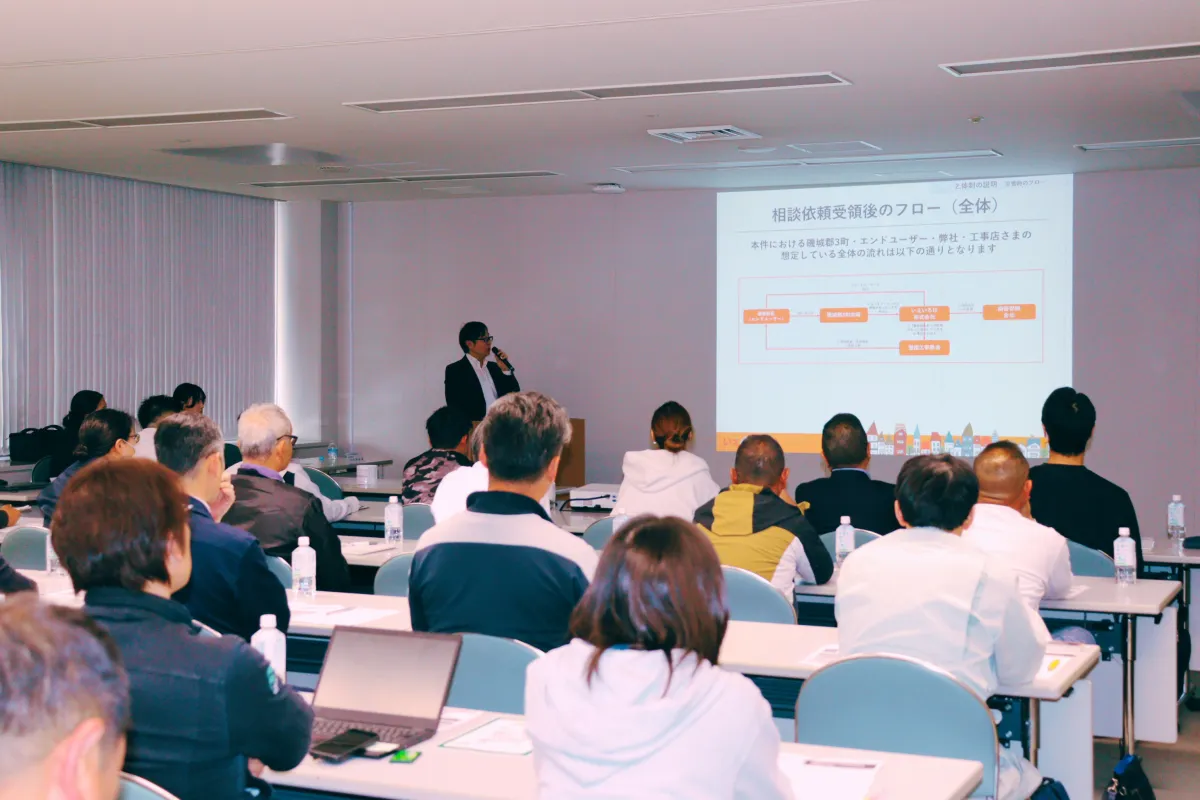 その後、いえいろはの代表取締役である白神康一郎が、災害時の連携フローについて具体的に説明しました。行政が情報を整理し、いえいろはが工事店への依頼・進捗管理を行うことで、工事店は応急処置や復旧工事に集中できるようになります。また、工事店には常時待機や強制的な出動要請はなく、自社の業務を優先しつつ協力することが可能で、地域貢献への参加を促進している点も特徴です。
