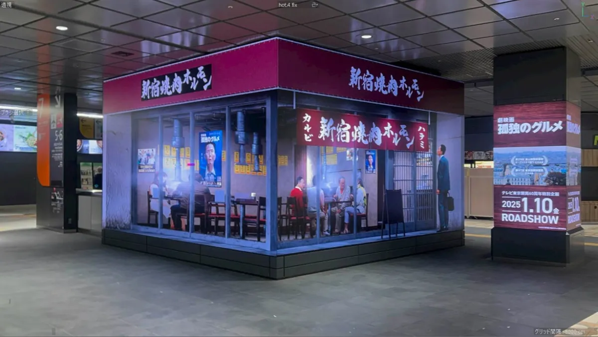 株式会社CGworksが手がけた3D屋外広告が、2025年1月10日に公開予定の映画「孤独のグルメ」のプロモーションとして新宿駅に登場しました。この広告は、まるで実在する焼肉店が駅構内に出現したかのような迫力満点のビジュアルで、多くの人々を魅了しています。