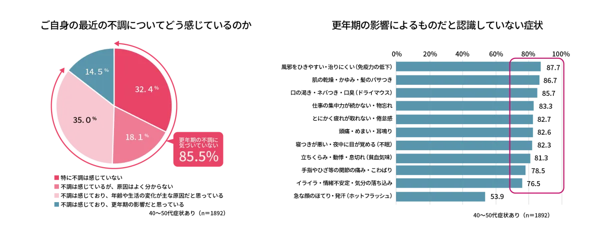 調査によると、倦怠感や不眠などの不調を感じているにもかかわらず、それを「更年期」の影響とは認識していない女性が多く存在しました。特に「肌の乾燥」や「頭痛」といった普段の生活で感じる症状ですら、半数以上がその原因を更年期とは結びつけきれていませんでした。このような状況をキューサイでは『隠れ更年期』と呼び、注意を促しています。
