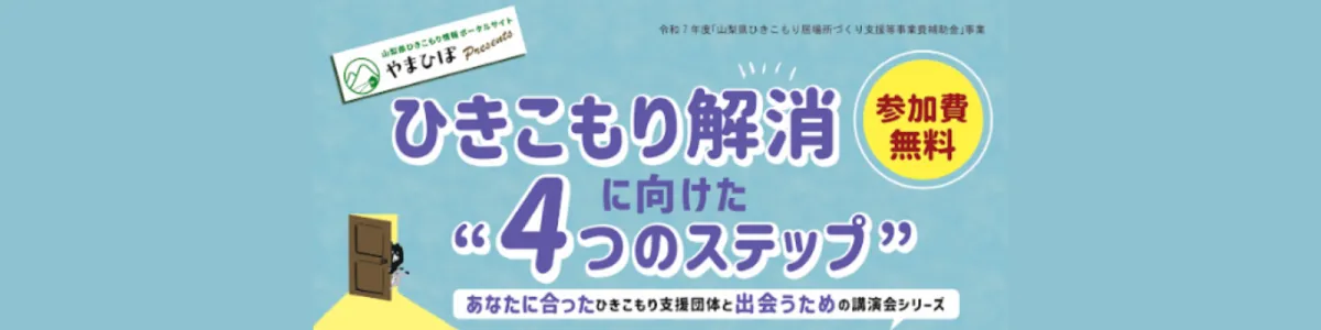 ひきこもりの問題は、情報不足や適切なサポートにアクセスできないことから、当事者やそのご家族が困難な状況に置かれることが少なくありません。この講演会は、山梨県ひきこもり情報ポータルサイト「やまひぽ」を運営する中で得た知見を基に、参加者が自分に合った支援団体と出会うための助けとなることを目的としています。