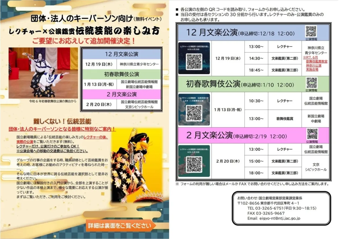 独立行政法人日本芸術文化振興会が主催する「伝統芸能の楽しみ方」の無料イベントが、12月19日、1月13日、2月20日の3日間で行われます。このイベントは、法人や団体のキーパーソンを対象とし、伝統芸能に関するレクチャーと、その後の公演鑑賞を通じて、参加者が日本の伝統文化をより深く理解することを目的としています。