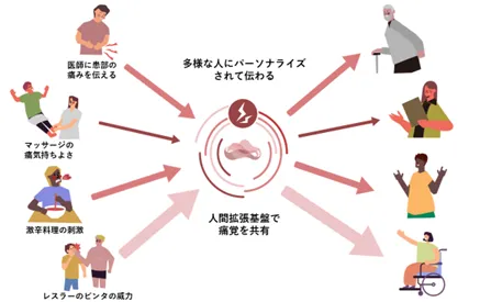この新技術は、三つの基本要素から構成されています。まず、痛覚に関するデータを把握するセンシングデバイス、次に痛覚の感度差を推定する「人間拡張基盤」、そして痛覚を再現するアクチュエーションデバイスです。この複合的なシステムにより、利用者は痛みを定量的に可視化し、それを他者と共有できるようになります。