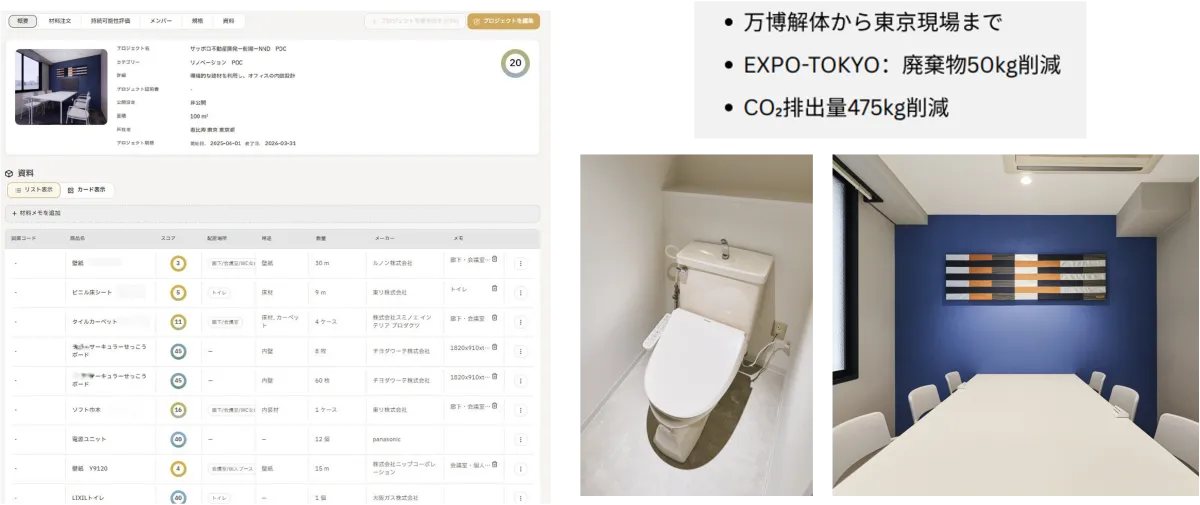 このプロジェクトでは、NewNormDesignが提供するサステナブル建材プラットフォーム「matinno」を駆使し、大阪・関西万博で使用された建材を東京・恵比寿のオフィス改修に再利用しています。サッポロ不動産開発株式会社が所有する「アルカサル」において、株式会社船場が施工を担当し、持続可能な内装デザインを実現しました。