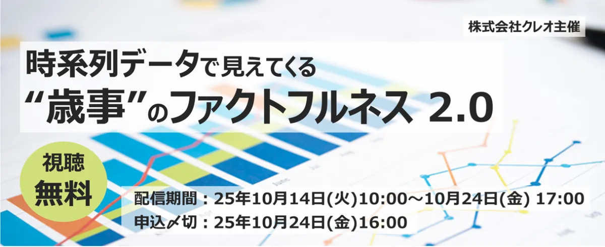株式会社クレオ(本社:東京都千代田区)は、2025年10月14日から24日まで、無料のオンラインセミナー「時系列データで見えてくる“歳事”のファクトフルネス2.0」を実施します。本セミナーでは、昨年配信した内容を再構成し、有料レポートの一部も紹介する予定です。