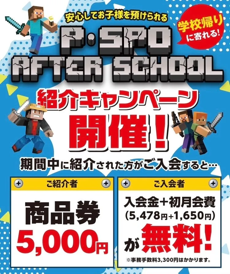 P・SPO アフタースクールでは、2025年7月1日から7月31日までの期間に特典付きの紹介キャンペーンを実施します。紹介者には5,000円分の商品券が提供され、入会者は入会金と初月の会費が合わせて14,828円が無料になります。ただし、事務手数料として3,300円は必要です。この機会にぜひ、新しい学びの場に参加してみませんか?