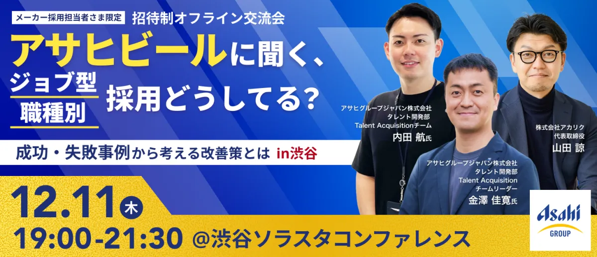 2025年12月11日、東京都渋谷区の渋谷ソラスタコンファレンスにて、アサヒグループジャパンと株式会社アカリクが共催したセミナーが開催されました。このイベントは「アサヒビールに聞く、ジョブ型/職種別採用どうしてる?成功・失敗事例から考える改善策とは」というテーマで、メーカー企業の人事・採用担当者が約30名参加しました。セミナーでは、ジョブ型雇用の現状と課題に関する貴重な洞察が提供されました。