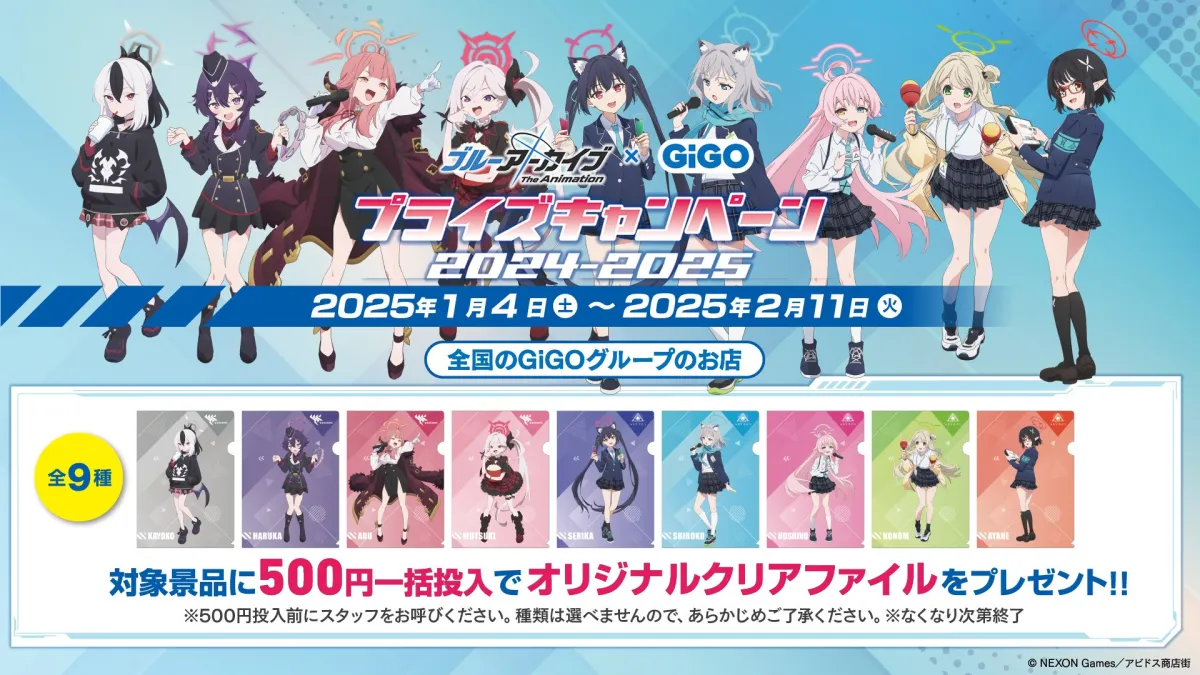 2025年1月4日より、株式会社GENDA GiGO Entertainmentが提供する「ブルーアーカイブ The Animation」とのコラボレーションキャンペーン『ブルーアーカイブ The Animation × GiGO プライズキャンペーン 2024-2025』が始まります。このキャンペーンは、全国のGiGOグループ店舗で行われ、限定のクレーンゲーム景品やオリジナルクリアファイルのプレゼントが用意されています。