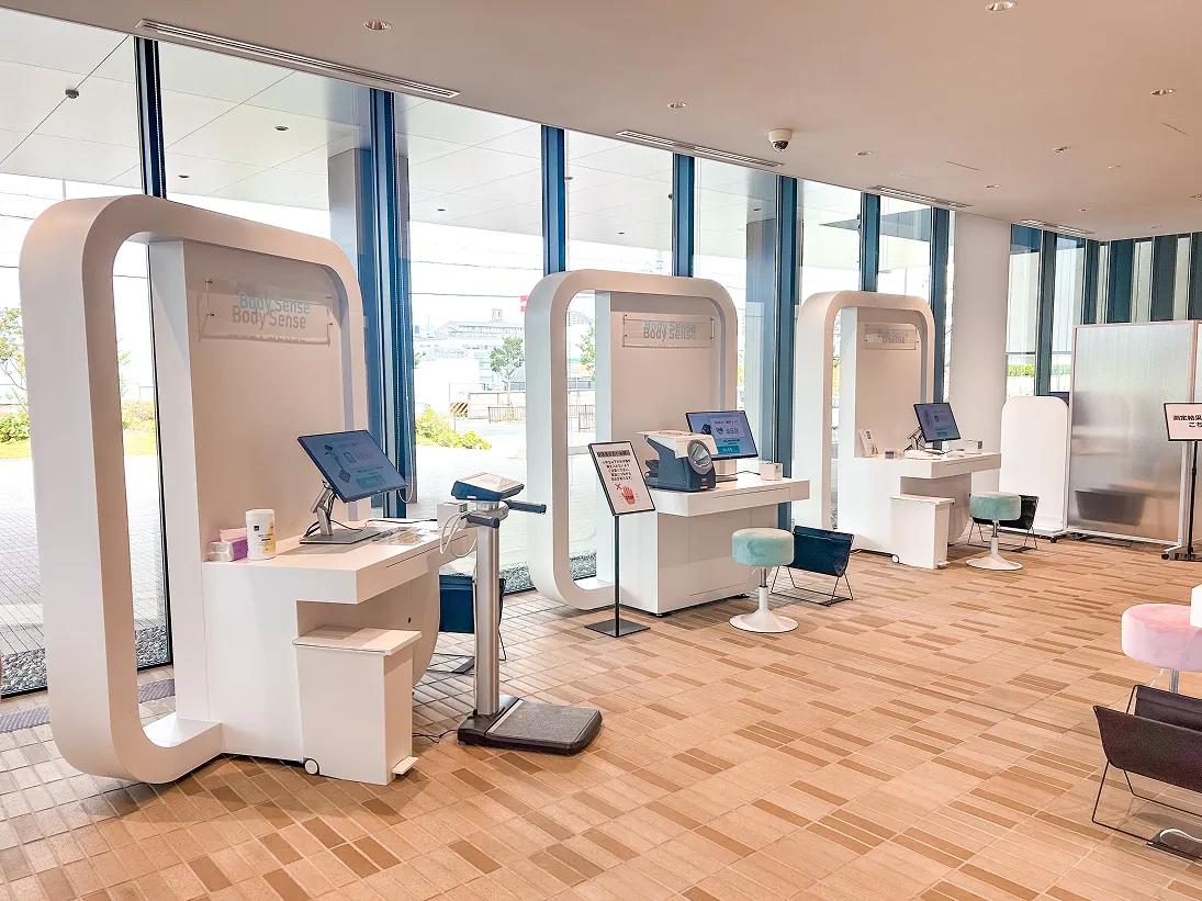 リニューアル後の『エア・ウォーター健都』では、まず「ヘルスケアスタジオ」が特徴的です。ここでは、来場者自身が健康状態を測定できる環境を整え、AGEsセンサや肌測定機器を用いてリアルタイムでデータを取得できます。測定データはAIによって分析され、それに基づいた食事メニューが提案されます。提案されたメニューは、併設されている「スクエアキッチン(カフェ)」で実際に提供されます。