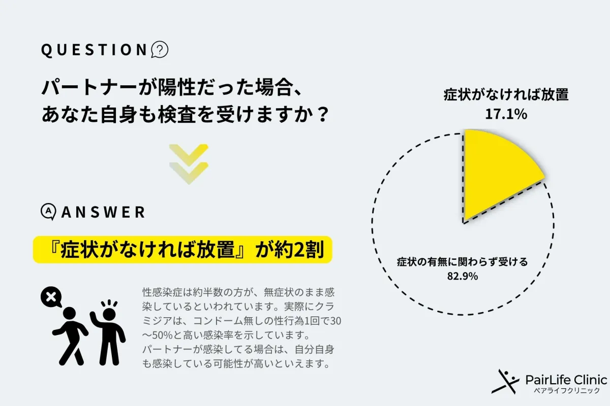 調査によると、パートナーが性感染症に感染した場合に自分も検査を受けるかという質問に対し、近く20%が「症状がなければ受けない」と回答しました。このことは、多くの性感染症が無症状であるため、感染拡大の原因ともなり得るのです。無自覚のままパートナーに感染を広げることから、検査受診の重要性が高まります。