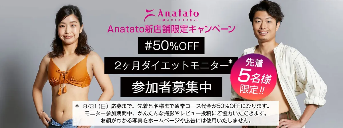 ただ今、Anatatoでは8月、9月限定のオープニングキャンペーンを実施中です。入会金が通常50,000円のところ無料、さらに短期集中の2ヶ月コースが10%OFF、そして新規オープンに合わせて大阪京橋店と明大前店では50%OFFの特別プランも用意されています。これからダイエットを始めようと考えている方にとって、非常にお得なチャンスです。