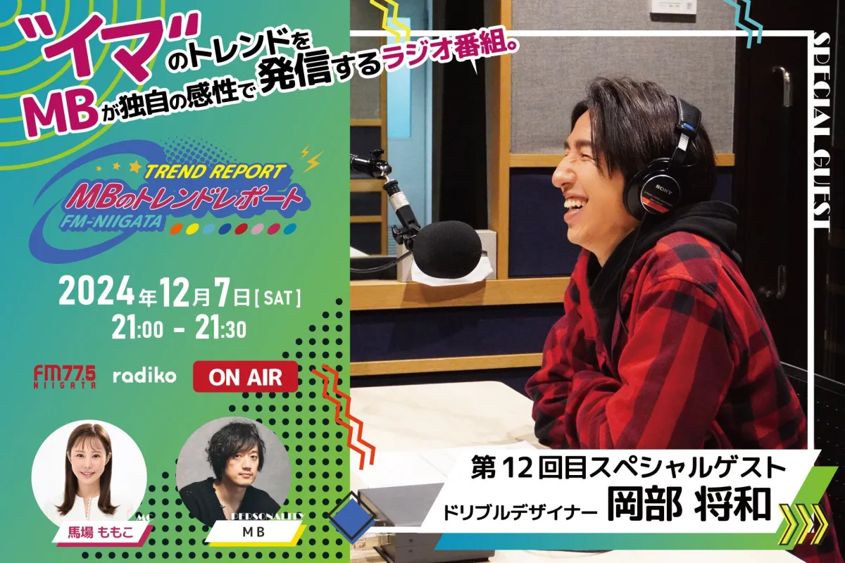 FM-NIIGATAでスタートした新しいラジオ番組『MBのトレンドレポート』が、注目すべきゲストを迎えることが決まりました。今回の第12回放送のスペシャルゲストとして呼ばれるのは、ドリブルデザイナーの岡部将和さんです。放送は2024年12月7日(土)の21時から、約30分間の内容でお届けされます。この番組は、日々変化するトレンドをMBが独自の視点で発信し、さまざまなジャンルのゲストを迎えながら、トレンド情報をいち早く届けることを目的としています。