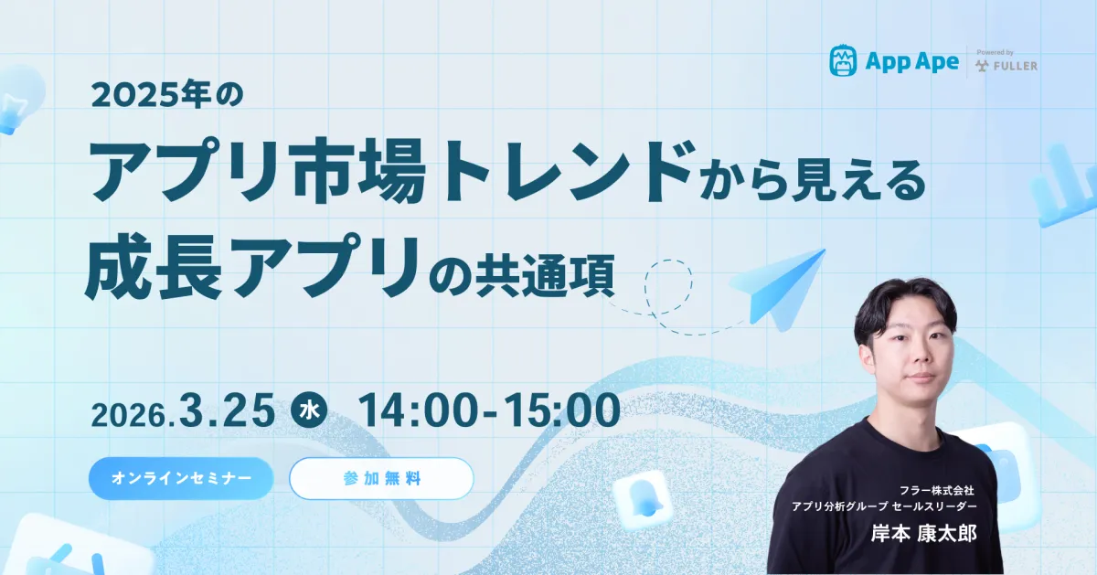 アプリ市場分析サービス「App Ape」を運営するフラー株式会社は、2026年3月25日(水)に、オンラインセミナー「2025年のアプリ市場トレンドから見える成長アプリの共通項」を開催します。本セミナーでは、最新の市場データをもとに、アプリの成長を支える要素や、データ活用のポイントについて解説します。