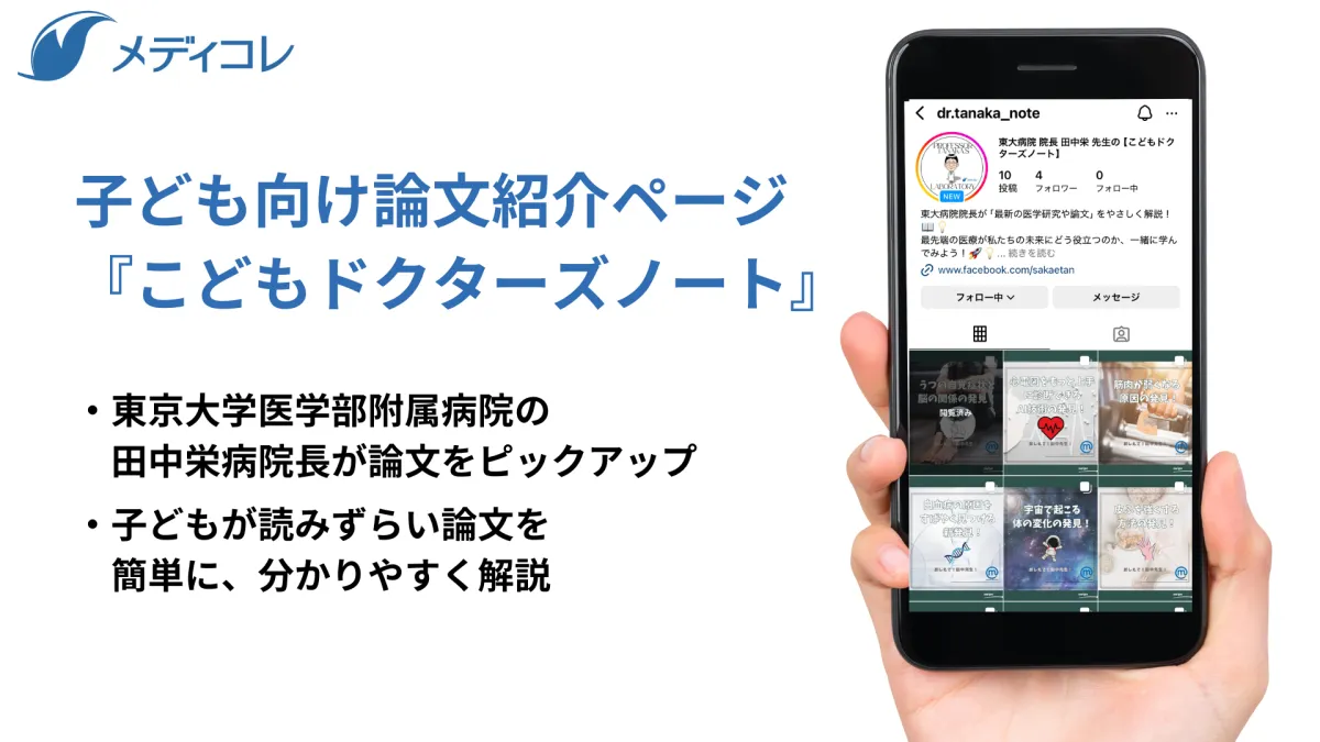 東京大学医学部附属病院の田中栄病院長が監修した子ども向け論文紹介ページ『こどもドクターズノート』が、株式会社メディコレと連携してInstagramに登場します。子どもたちに医学を身近に感じてもらうことを目的としたこのプロジェクトは、難しい医学の話をやさしく、楽しく伝えることをコンセプトにしています。