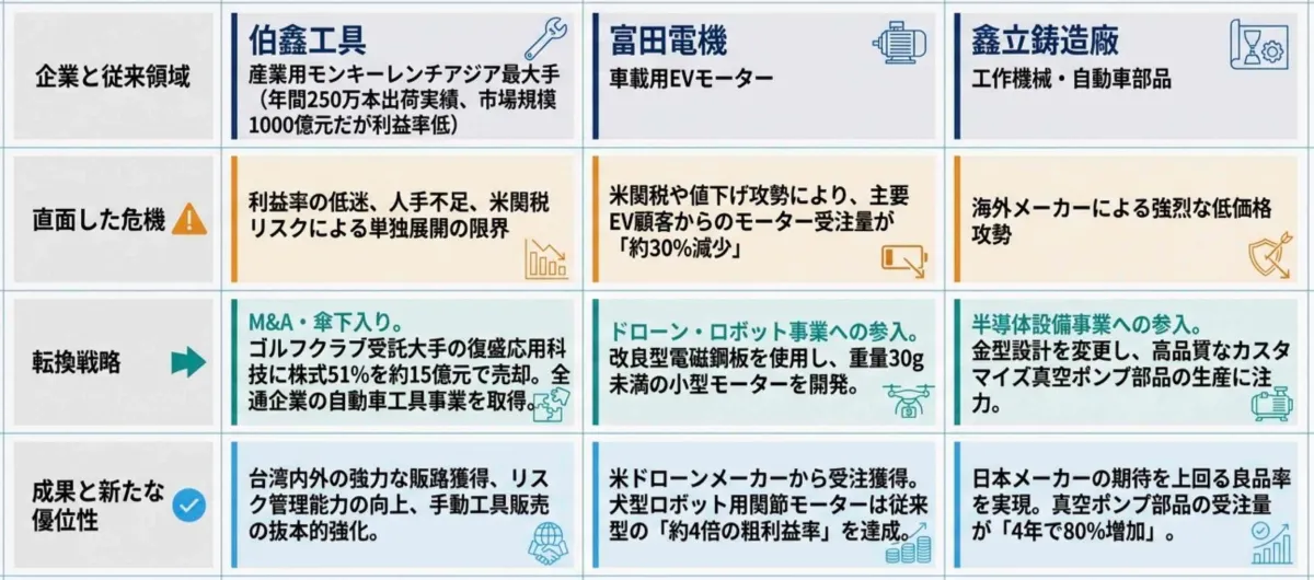 台湾における製造業は、米国の関税政策や為替変動などの圧力に直面しています。このような厳しい環境下で、手動工具の大手・伯鑫工具はゴルフクラブの受託製造を行う企業の傘下に加わり、販路の拡大を図っています。一方、富田電機もEV(電気自動車)依存を減少させ、ドローンやロボット向けの小型モーターの開発に取り組むなど、産業の多角化を実現しようとしています。このような事例から、異業種間の連携がますます重要であることが分かります。