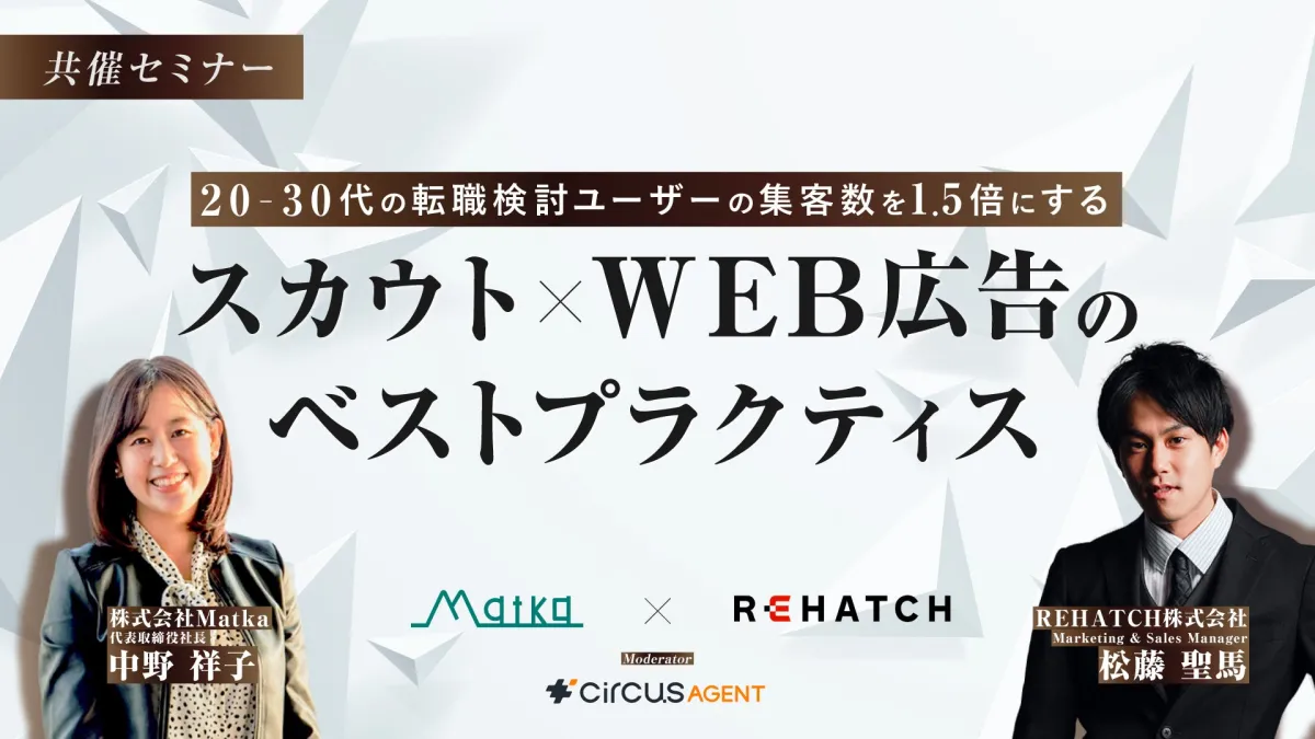 若手人材の集客が厳しく感じる企業様に朗報です。REHATCH株式会社は、株式会社Matka、circus株式会社と共同で、オンラインセミナー「20〜30代の転職検討ユーザーの集客数を1.5倍にするスカウト×Web広告のベストプラクティス」を開催します。このセミナーでは、マーケティングに悩む担当者が抱える問題を解決する手法を学ぶことができます。