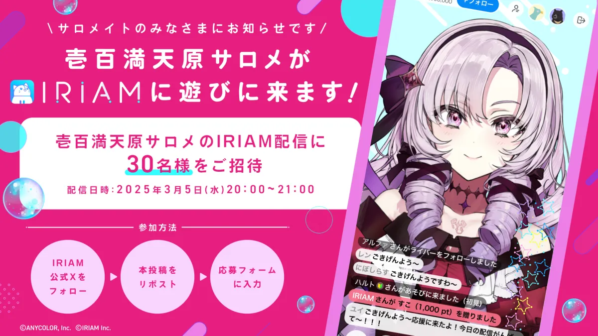 2025年3月5日(水)20:00、VTuber/バーチャルライバーグループ「にじさんじ」に所属する壱百満天原サロメが新感覚Vtuberアプリ『IRIAM』において配信を行います。この初挑戦にあたり、視聴者30名を募集するキャンペーンもスタートしており、ファンにとっては見逃せないイベントとなること間違いなしです。