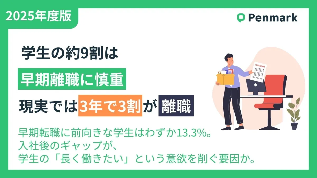 株式会社ペンマークが実施した最新の調査によると、Z世代の学生の約9割が就職後に早期離職に対して慎重な姿勢を示しています。しかし、現実には3年以内に離職する大卒者が34.9%に上るというデータが示す通り、理想と現実の間には大きなギャップが存在しています。