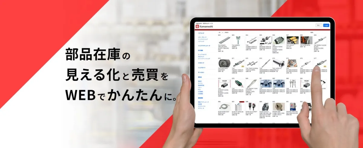 KAMAMESHIは、企業が保有する設備部品の管理や故障時の対応を効率的に行うためのプラットフォームです。具体的には、社内の部品管理システムを活用し、会員同士で予備品の売買をスムーズに行えるサービスを提供しています。これにより、部品在庫の管理がデジタル化され、リスクが可視化されるため、必要な部品をすぐに融通できる場を提供します。