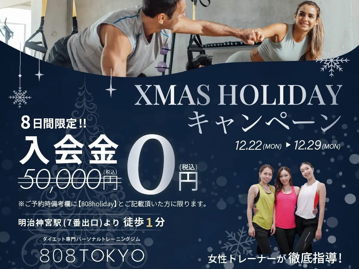 原宿・表参道に位置するダイエット専門のパーソナルジム、808TOKYOがクリスマスにぴったりな限定キャンペーンを実施します。このキャンペーンでは、通常50,000円の入会金が0円になるという大変お得な内容です。
