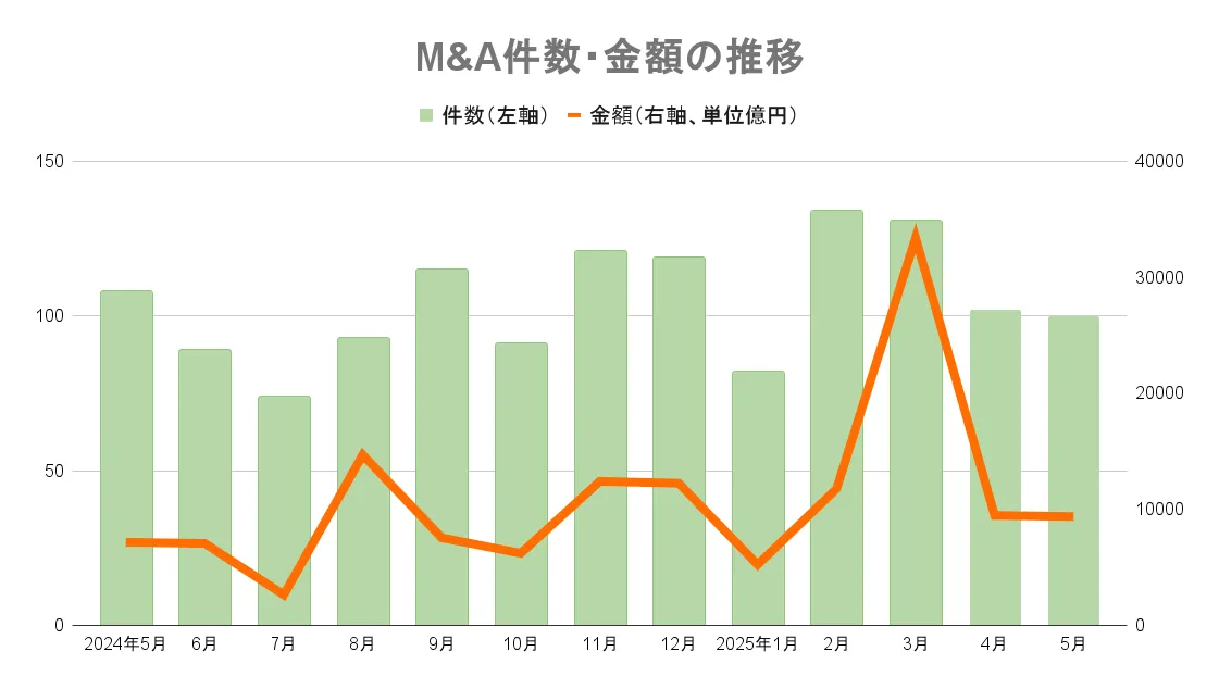 2025年5月の日本のM&A(企業の合併・買収)市場について、最近の動向を詳しく見ていきます。M&A件数は前年と比べて8件減少の100件となり、4ヶ月ぶりに前年同月比での減少という結果が出ました。