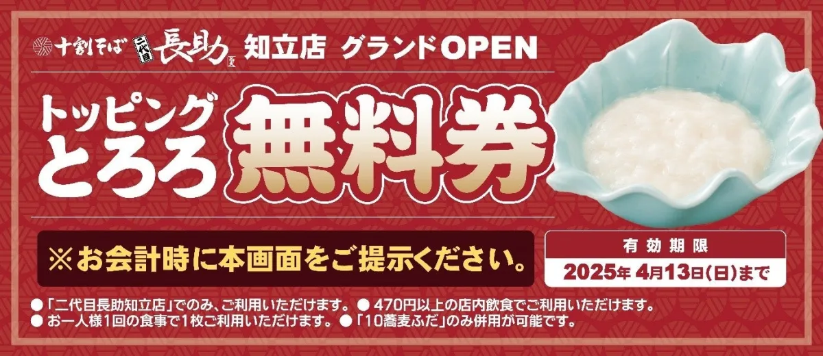 「二代目長助知立店」のオープンを記念して、様々な企画が用意されています。まず、先着2,000名様に「サガミオリジナルそば茶500ml」がプレゼントされるほか、特別価格のメニューも用意されています。たとえば、かけそばや鴨汁ざるそばがお得な価格で楽しめるほか、大海老天やちくわ天も特別価格で提供されます。これを機会にぜひ立ち寄りたいものですね。