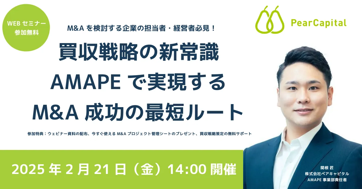 2025年2月21日(金)、M&A(合併・買収)を検討中の企業担当者や経営者のために、株式会社ペアキャピタルが主催するウェビナー「買収戦略の新常識」がオンライン上で開催されます。このウェビナーでは、最新のM&Aプラットフォーム「AMAPE」を活用した効率的な買収プロセスや成功率を高めるための戦略について解説されます。