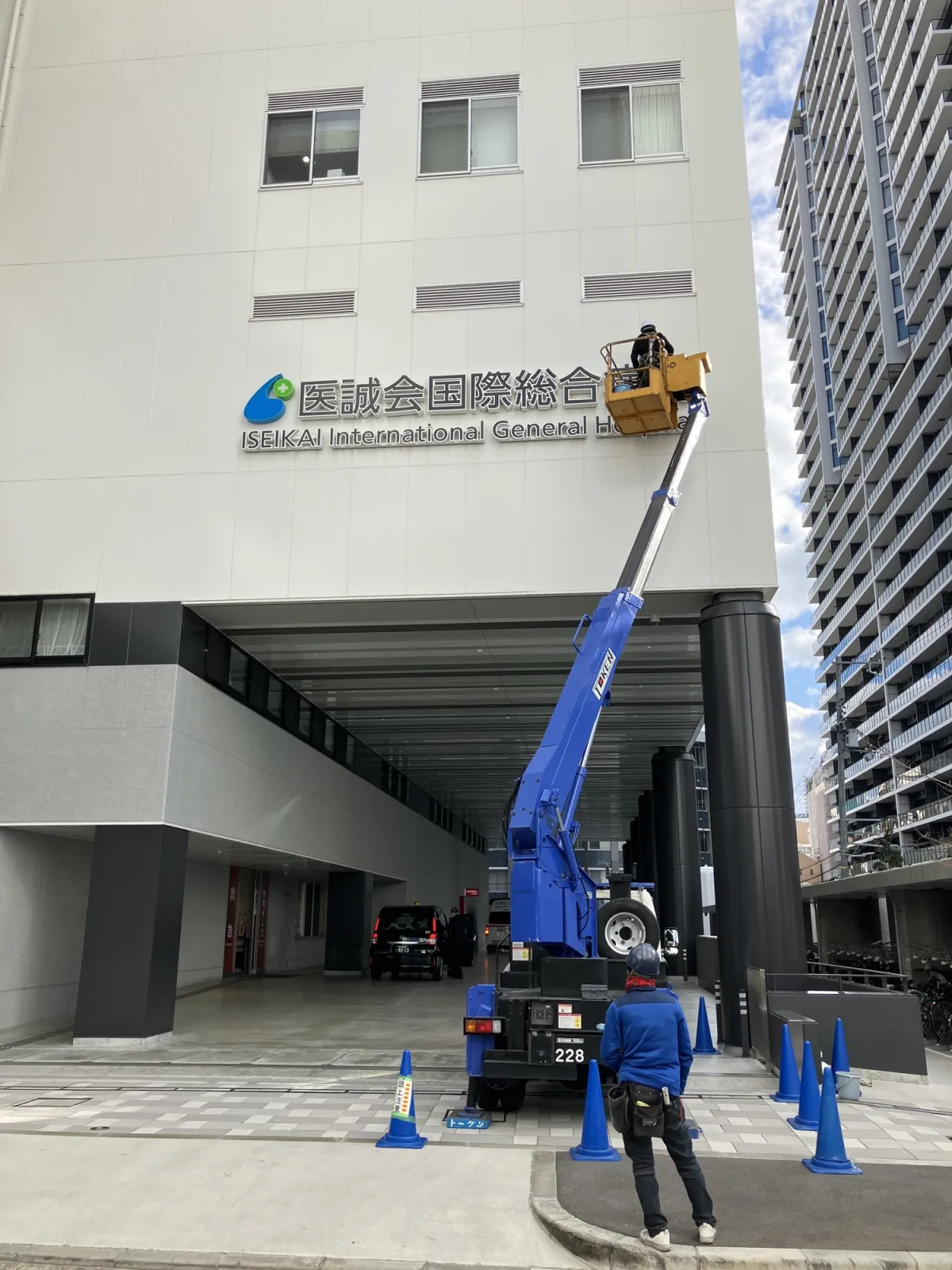大量の清掃が必要な際には専門業者の協力を得て、重機を使った高所の清掃作業も行われます。特に、外装ガラスや看板の清掃など、高所で手が届きにくい部分は、専門的な知識と技術が必要です。清掃活動では普段手が届かない場所も徹底的に掃除されるため、病院の外観は常に整然としています。