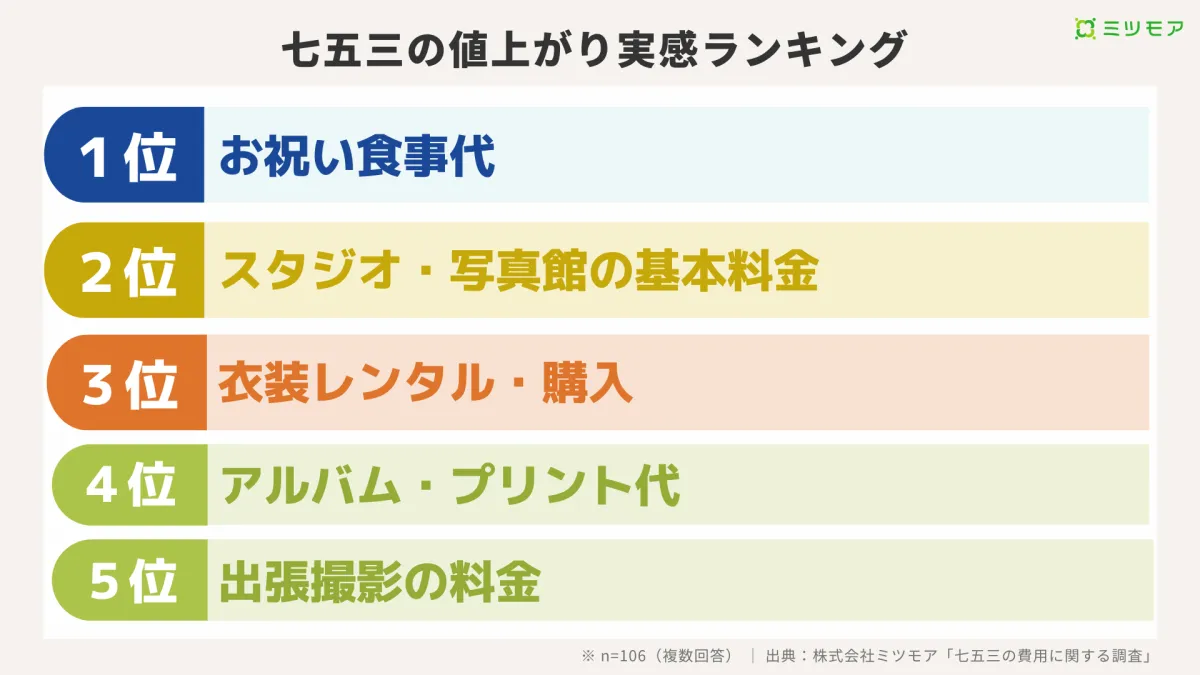 帝国データバンクの調査によれば、2022年には飲食店の原価率が高騰し、2025年には約6000商品が値上がりする見込みです。これは、家族の特別な日である七五三にも影響を与えており、実際に食事代を確認した45人のうち、68.9%が「値上がりした」と感じています。