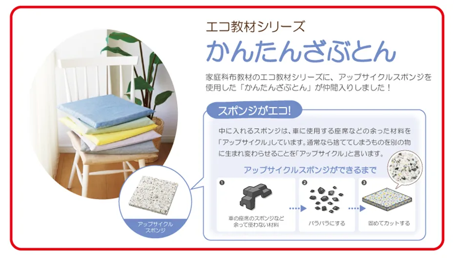 「かんたんざぶとん」は、小学校の家庭科の授業でミシンを使ったぬいぐるみ制作を学ぶ教材です。この教材では、ペットボトルなどから再生されたポリエステル生地を使用したざぶとんカバーを作成することができます。そして、その中に入れるスポンジとして、太平洋工業のアップサイクルスポンジが使用されるのです。