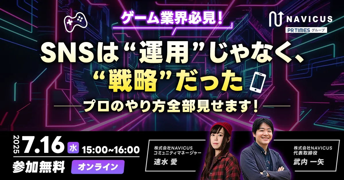 2025年7月16日(水)、株式会社NAVICUSが提供する無料ウェビナー「ゲーム業界必見! SNSは“運用”じゃなく、“戦略”だった──プロのやり方全部見せます!」が開催されます。このウェビナーは、国内外のゲーム事業に従事するマーケティング担当者やプロデューサーを対象とし、利益を上げつつファンコミュニティを築くための重要な洞察を提供します。