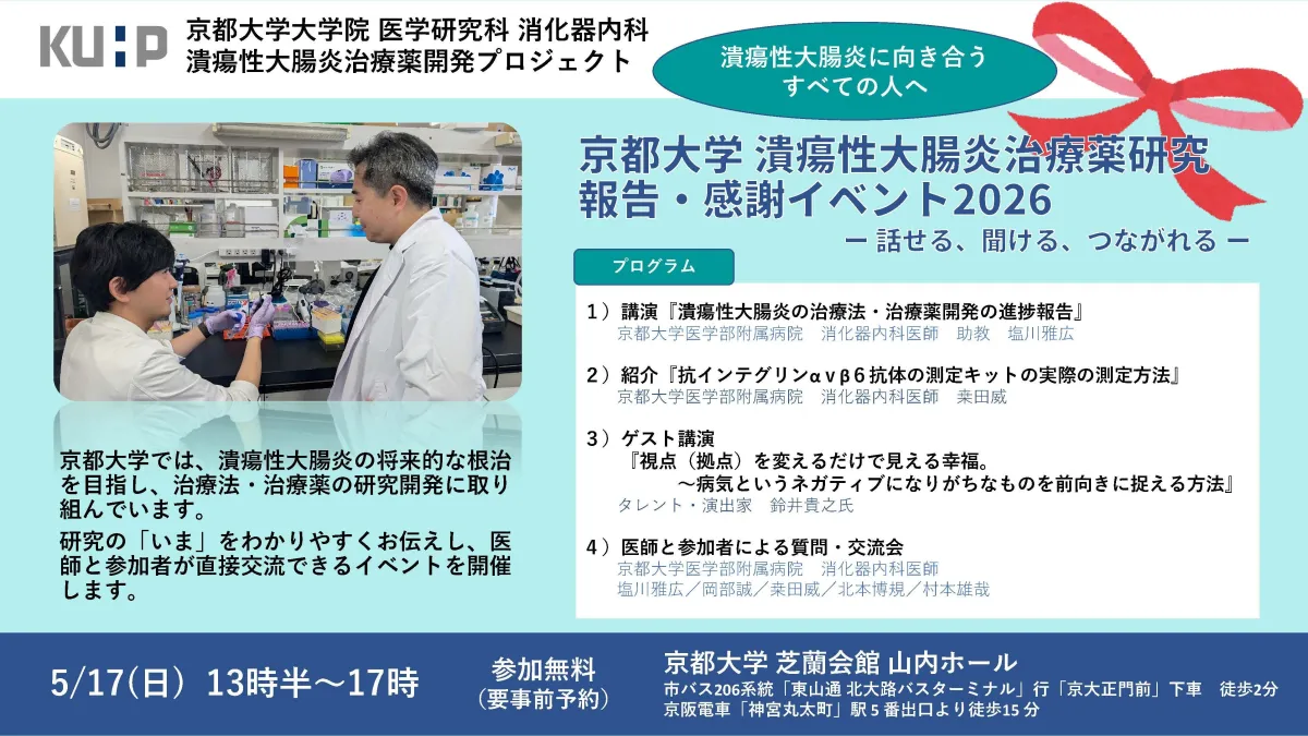 2026年5月17日、京都大学医学部附属病院が主催する「京都大学 潰瘍性大腸炎治療薬研究 報告・感謝イベント2026」が開催される。このイベントは、潰瘍性大腸炎に対する新たな治療法や研究の進捗を紹介し、患者やその家族、医療関係者と直接対話できる貴重な機会となる。